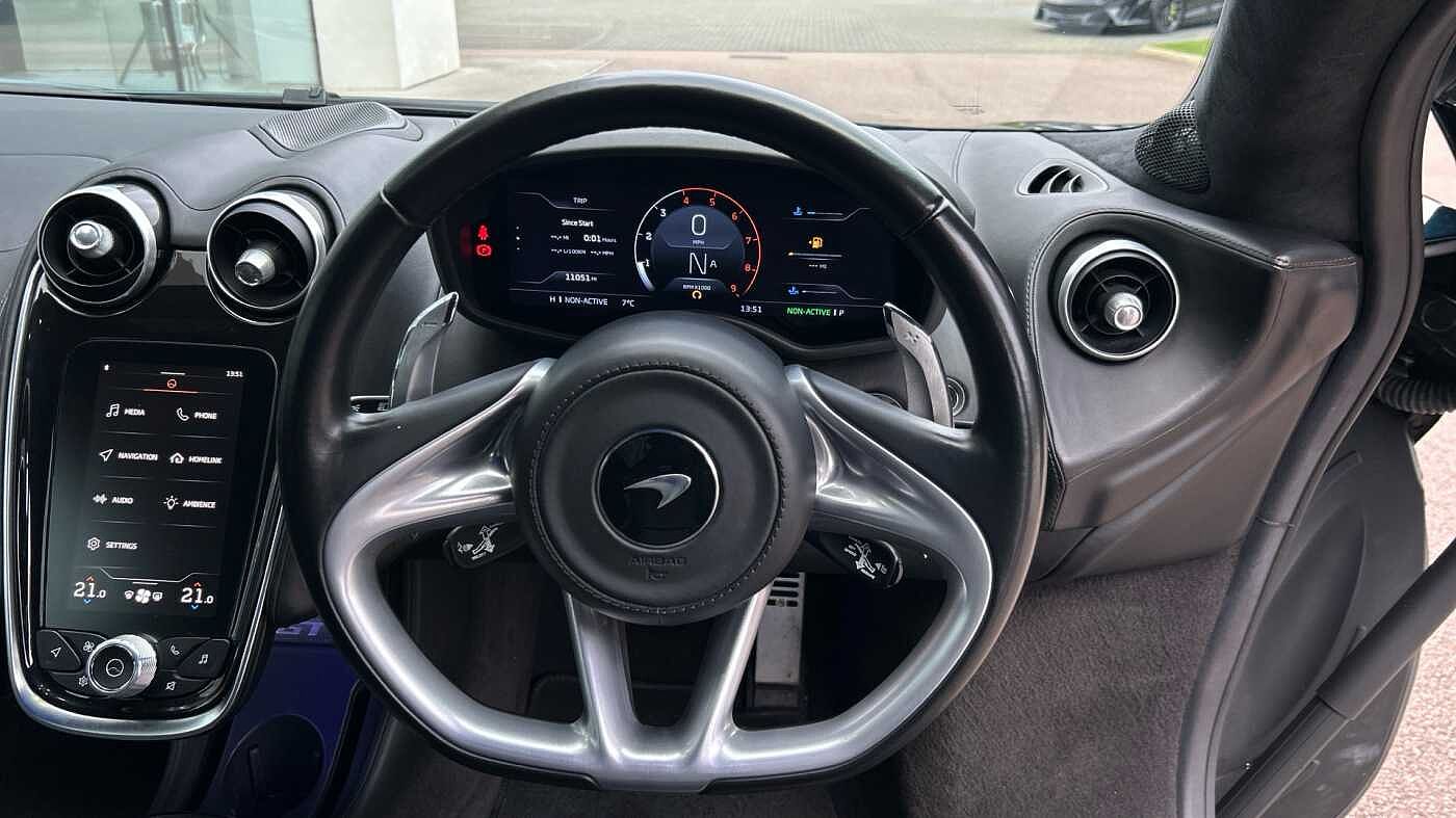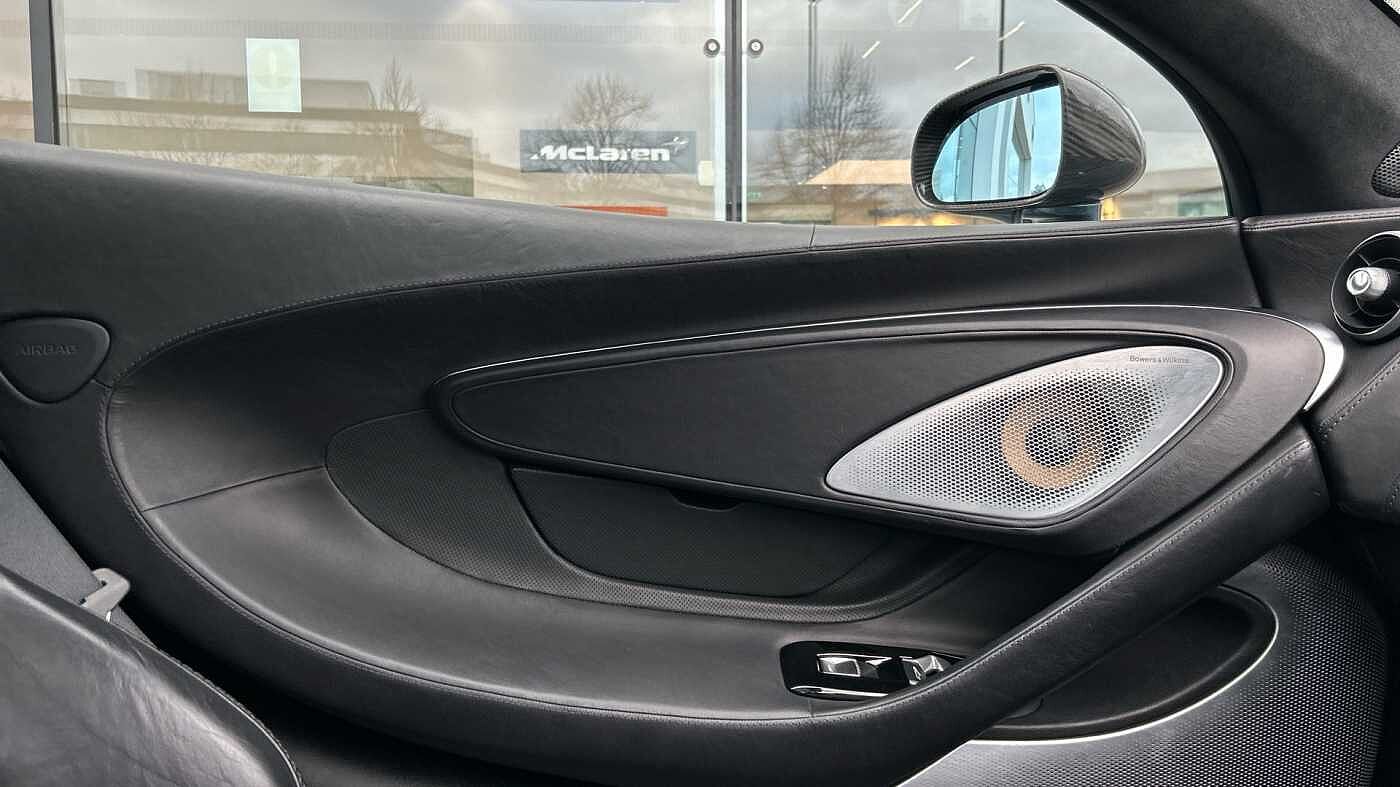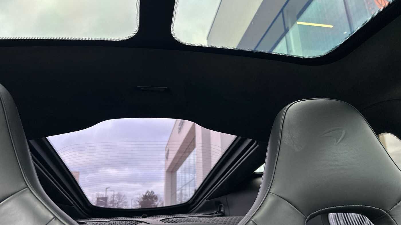 Serpentine Elite Paint, Carbon Fibre Exterior Pack (carbon Fibre front splitter, rear diffuser, side skirts, wing mirrors), Electrochromic Roof, Sports Exhaust, Natural Titanium Exhaust Finisher, Privacy Glass, 10-Spoke Lightweight Forged Wheels, Silver Wheel Finish, Carbon Ceramic Brakes, Red Calipers with Silver Logo, Bowers and Wilkins Audio System. Interior, Luxe Design Jet Black, Leather Sill Panel, Gloss Black Seat Backs, Jet Black Leather Steering Wheel, Black Seatbelts, Black Leather Seats, Carbon Black Carpet, Jet Black SuperFabric Luggage Bay Floor, Carbon Black Vinyl Luggage Bay Sides, MPH Instrument Cluster, Extended Jet Black Floor Mats, Luggage Retention Strap. P22 Luxe, Premium Pack, Practicality Pack, Lithium-ion Battery Charger, 433Mhz TPMS and Key Frequency, Front and Rear Parking Sensors, Parking Sensors with Rear Camera, Volumetric Alarm, Vehicle Tracking System, Vehicle Lift. 4 McLraren Service Stamps and complete with 12 months McLaren Warranty